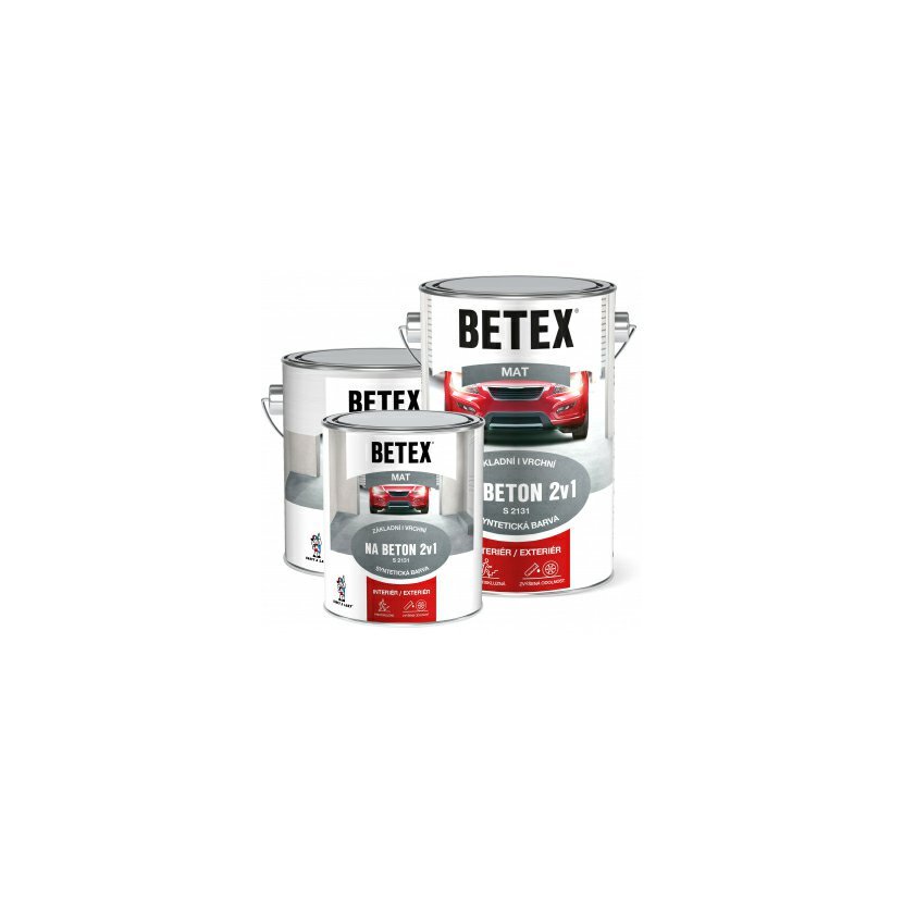 BETEX 2v1 Na Beton (S2131B) je syntetická barva určená pro nátěry betonových podlah v interiérech i exteriérech. Jedná se o systém "2v1" – barva plní funkci penetrace (v první ředěnější vrstvě) i vrchního odolného nátěru. Nátěr je odolný vůči vodě, povětrnostním vlivům a mírnému mechanickému zatížení. Je ideální pro sklepy, garáže (lehčí zátěž), dílny, balkóny či zídky.