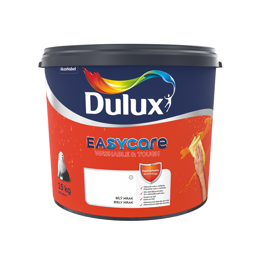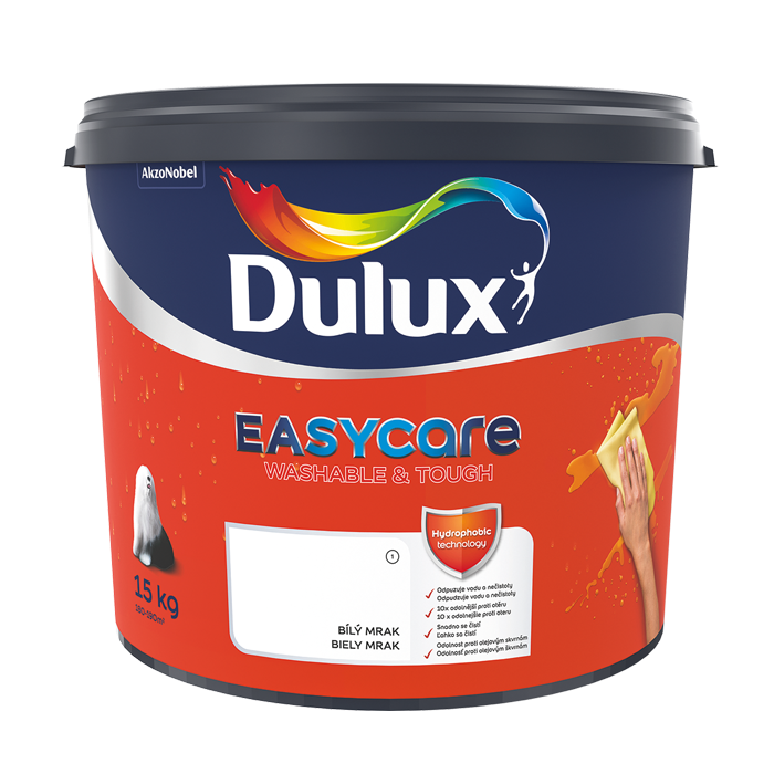 Dulux EasyCare je revoluční interiérová barva s hydrofobními vlastnostmi. Díky speciálnímu povrchu odpuzuje vodu a tekuté nečistoty, čímž zabraňuje jejich proniknutí hlouběji do podkladu. Vytváří dokonale matný film s nejvyšší odolností proti vzniku skvrn, které lze velmi snadno odstranit. Barva je 10x odolnější vůči otěru než běžné emulzní barvy (naměřený úbytek pouze 1,3 µm po 200 cyklech).