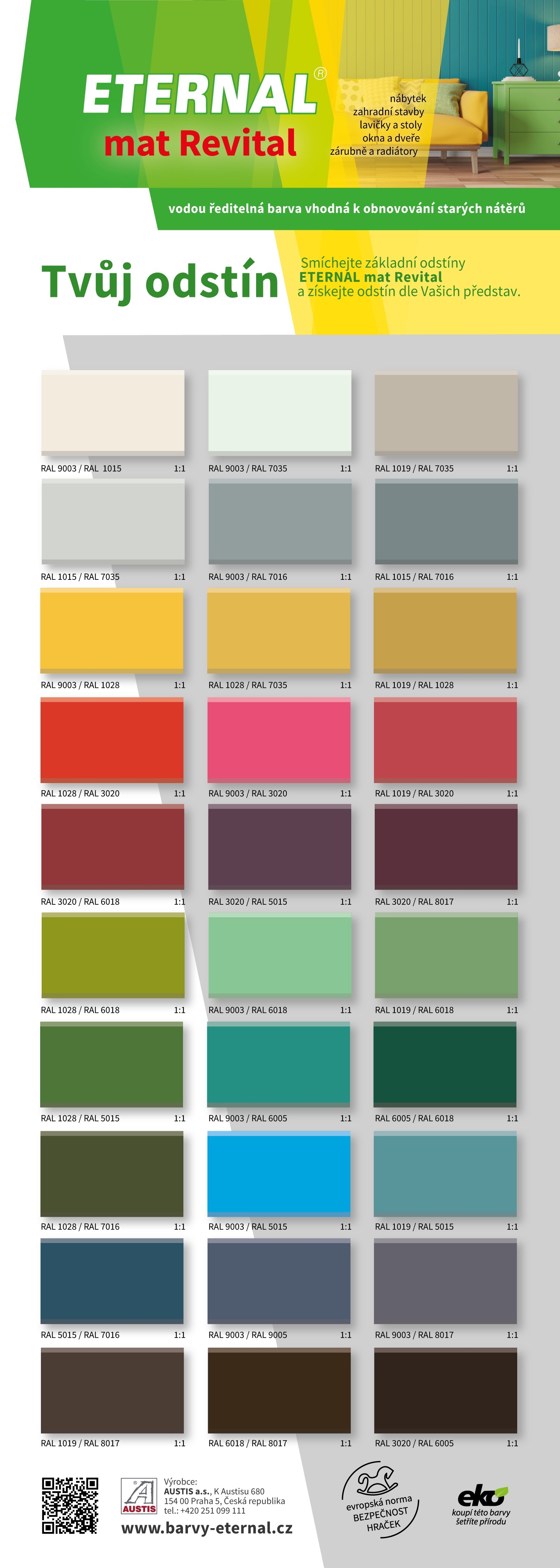 ETERNAL mat Revital je hedvábně matná univerzální akrylátová barva pro venkovní i vnitřní použití. Díky vynikající přilnavosti ke starým syntetickým a olejovým nátěrům je ideální pro renovace nábytku, oken, dveří, radiátorů či dětských hřišť. Splňuje normu EN 71-3 pro bezpečnost hraček.