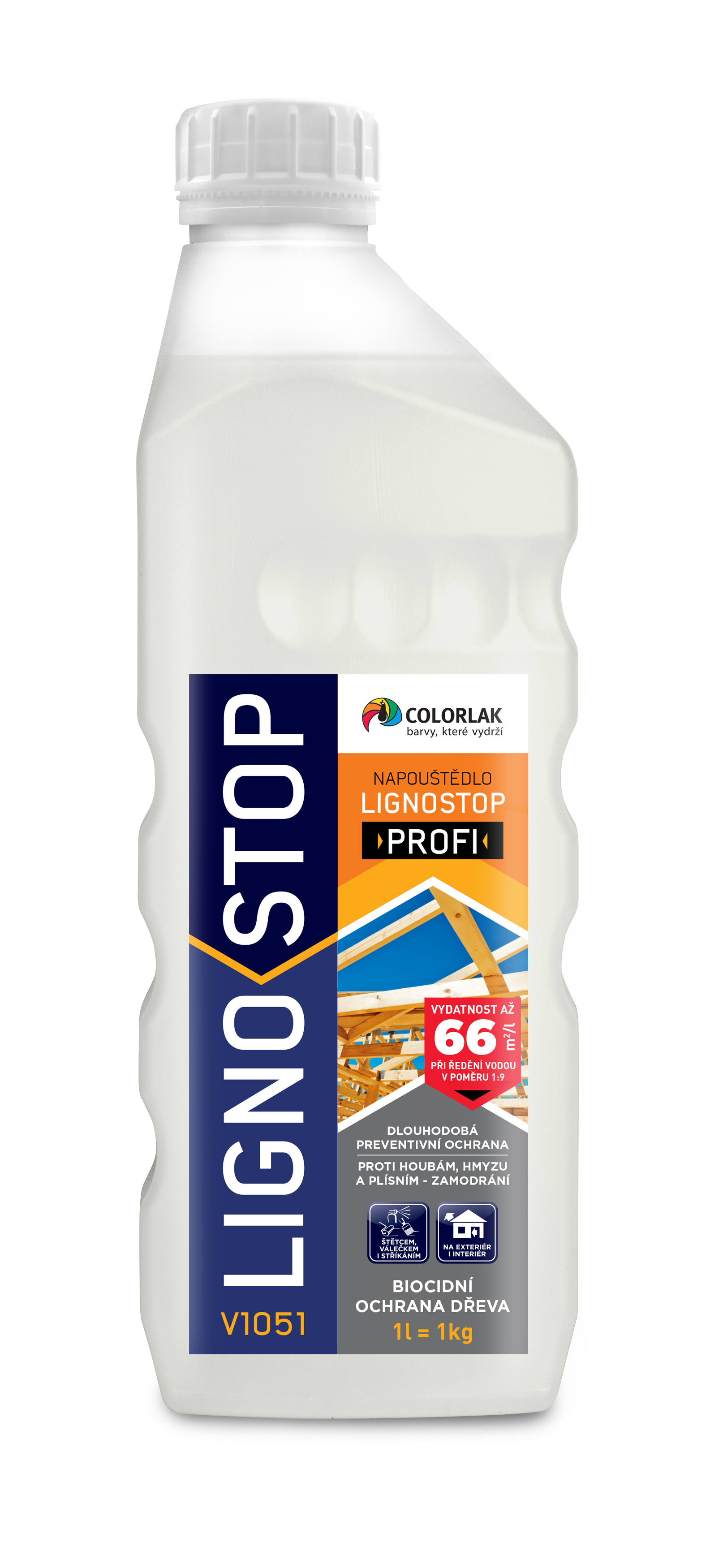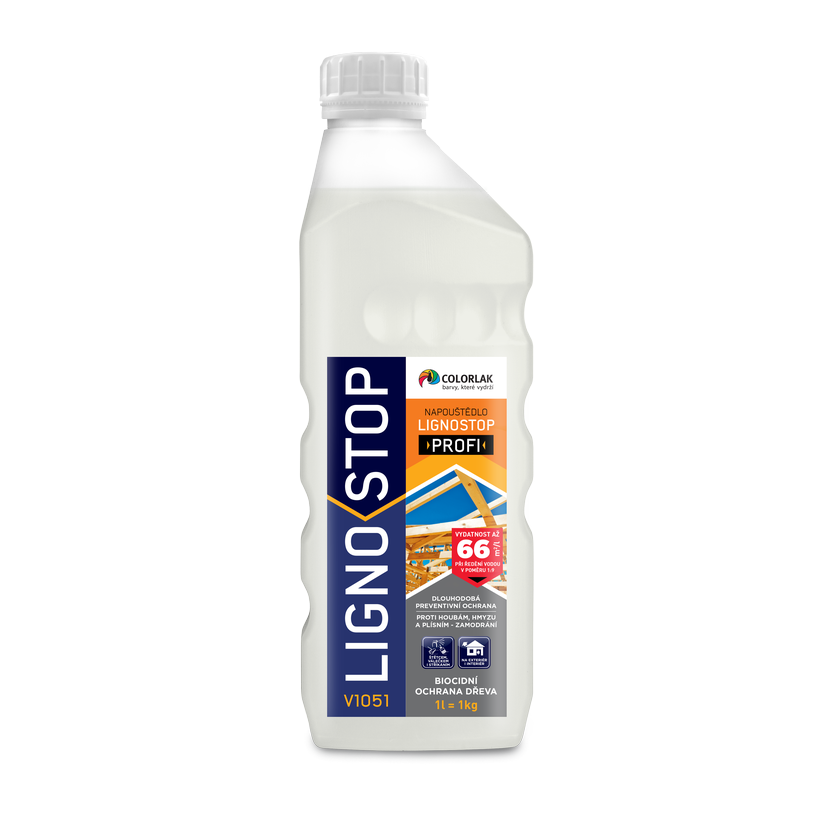 **LIGNOSTOP PROFI V1051** je vysoce účinný koncentrovaný biocidní přípravek určený k profesionální preventivní ochraně dřeva proti dřevokaznému hmyzu, dřevokazným houbám a plísním. Je určen pro interiéry i exteriéry, zejména pro nátěry krovů, střešních konstrukcí a stavebního řeziva. Přípravek po zaschnutí ve dřevě fixuje účinné látky a stává se nevyluhovatelným vodou, což zajišťuje dlouhodobou ochranu i v náročných podmínkách. Díky své koncentrované formě umožňuje aplikaci nátěrem, postřikem nebo máčením. Po zaschnutí lze na ošetřené dřevo nanášet další dekorativní nátěry.