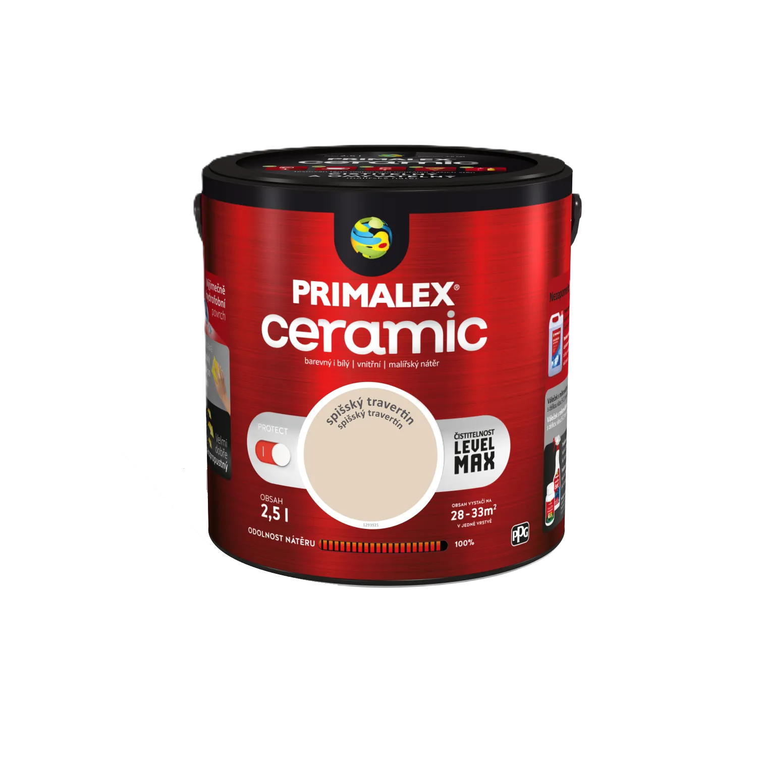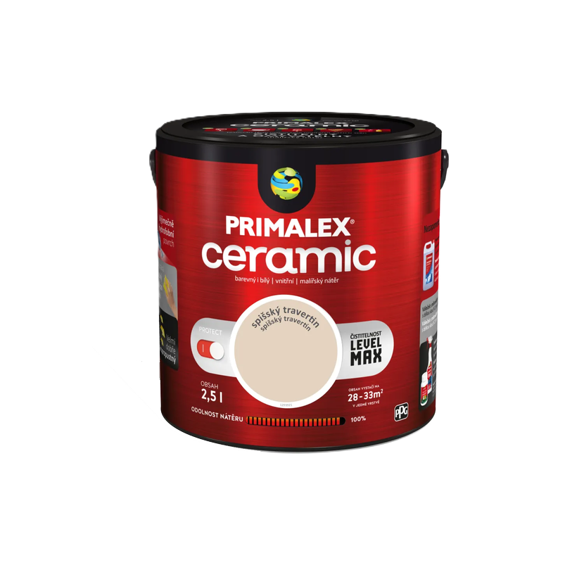 Primalex Ceramic je revoluční interiérový nátěr prvotřídní kvality, který vytváří výjimečně odolný, hydrofobní a paropropustný povrch. Díky inovativním složkám zabraňuje pronikání nečistot do hloubky a svou čistitelností se blíží keramickým povrchům. Je ideální volbou pro vysoce zatěžované prostory.