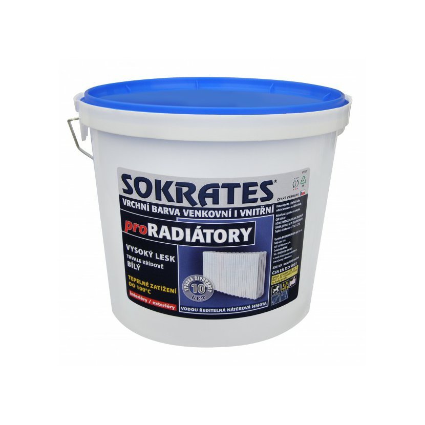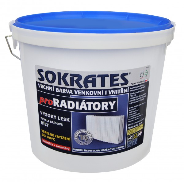SOKRATES® na radiátory je profesionální krycí barva určená k nátěrům topných těles a rozvodů teplé vody s tepelnou odolností do +100 °C. Poskytuje tvrdé, ale pružné nátěry s křídovou bělostí, které nežloutnou ani nekřehnou. Díky speciálnímu zesíťování nátěr nekoroduje ani při sušení vlhkých věcí přímo na tělese. Je vhodná i na dřevěné a minerální podklady v interiéru i exteriéru.